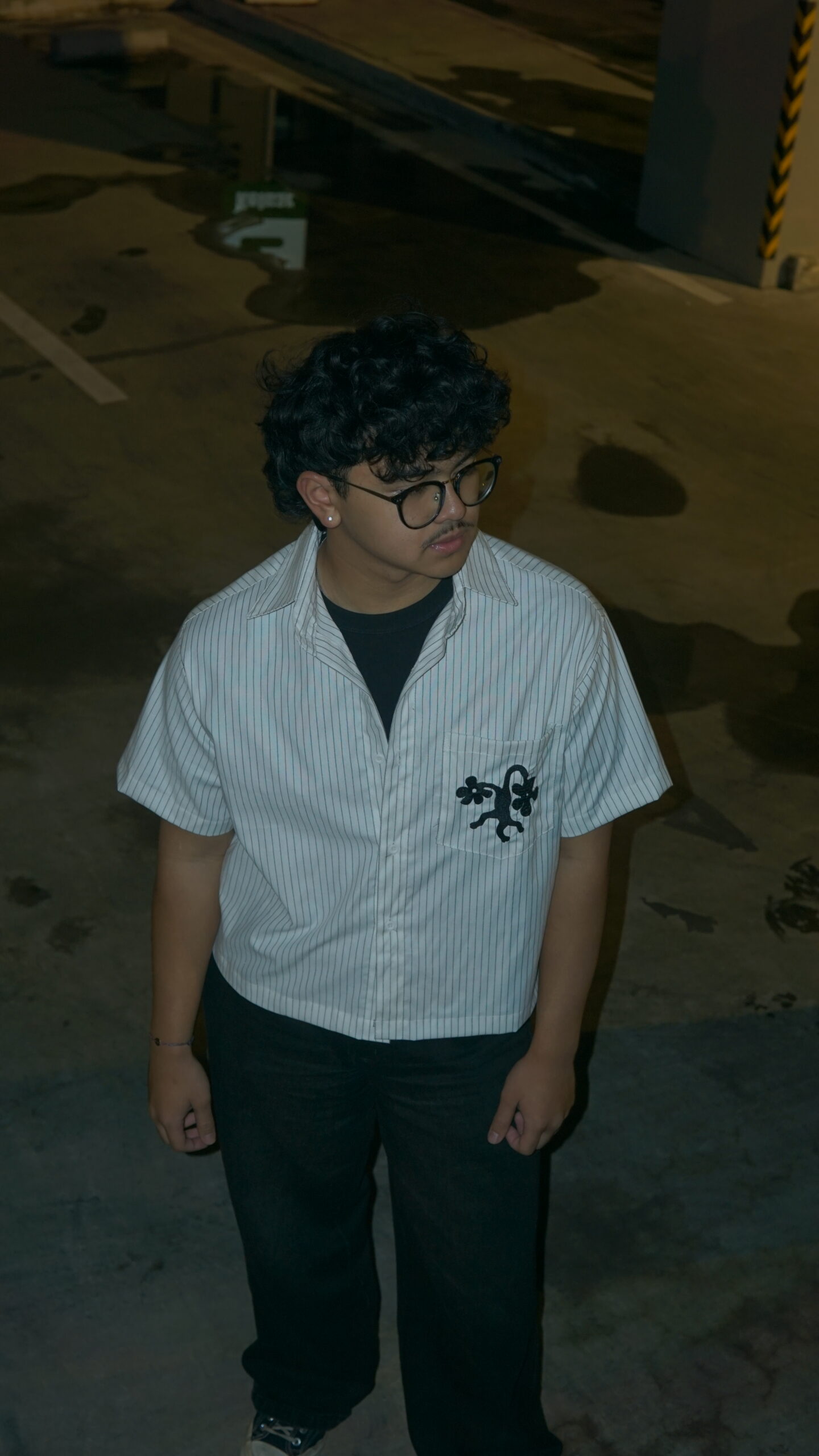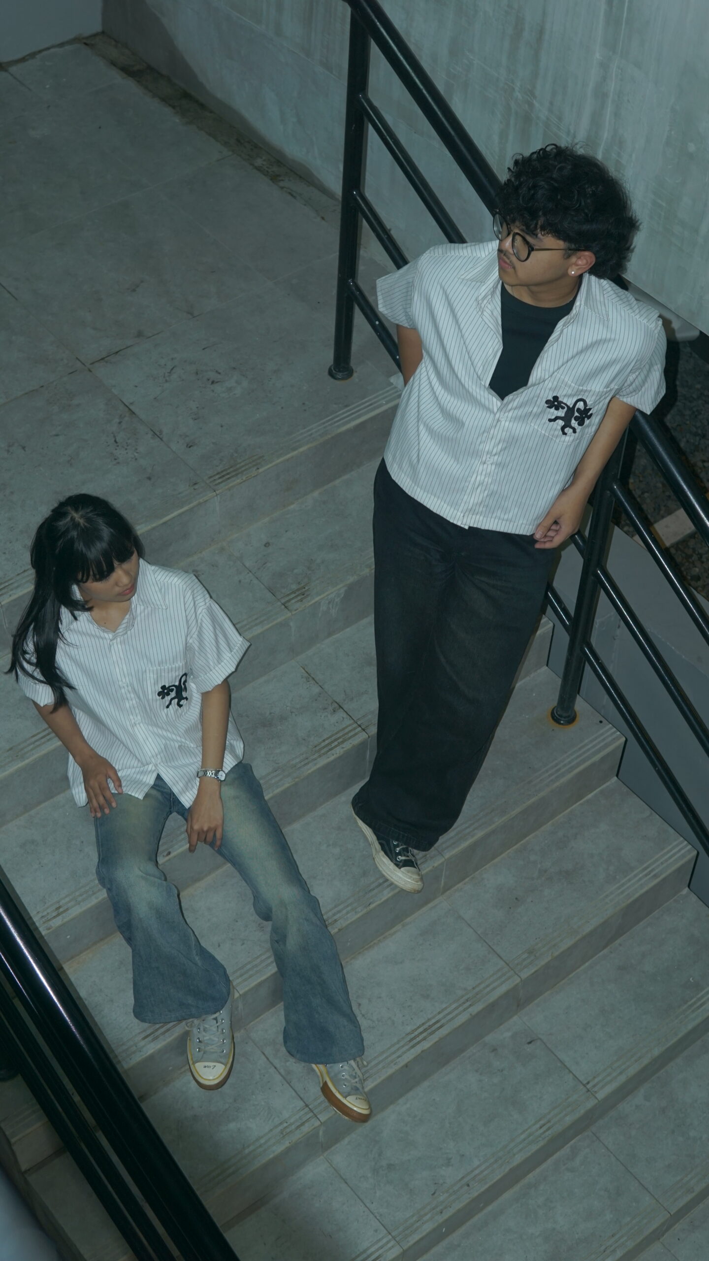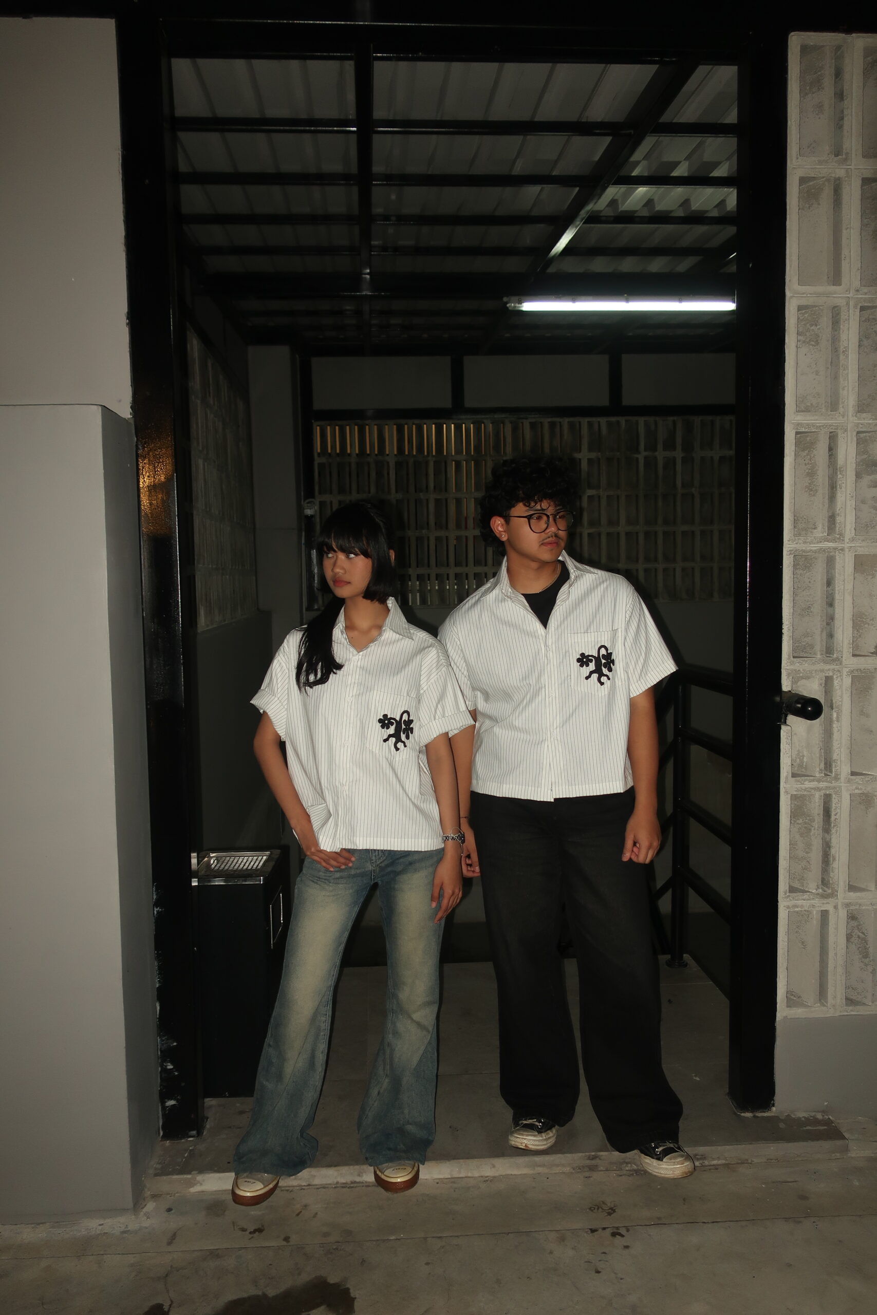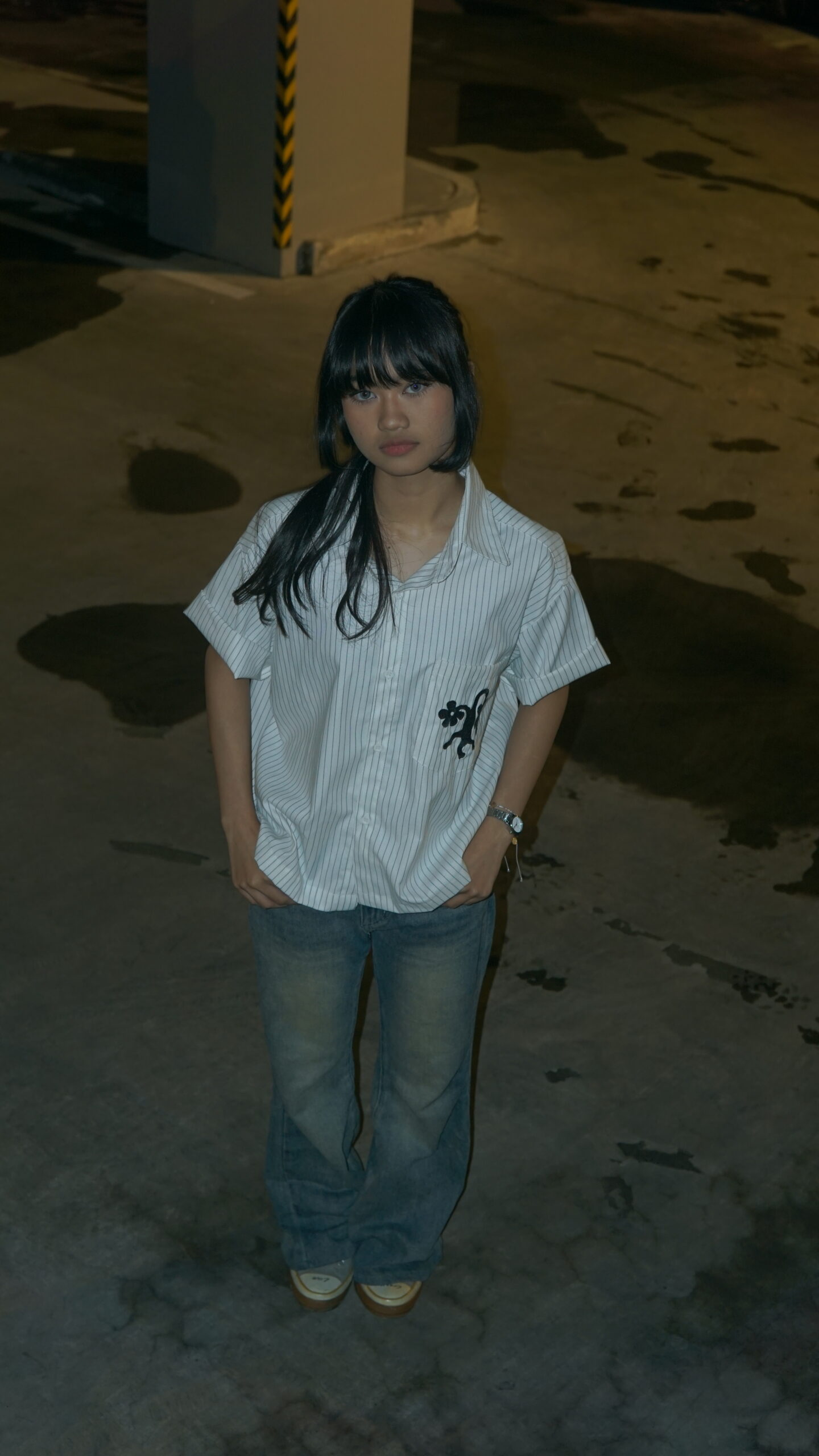 White striped linen oxford fabric with floral embroidery on the pocket