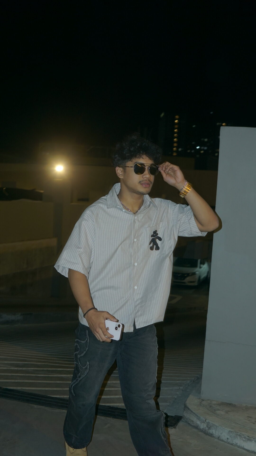 cream striped linen oxford fabric with flower figure embroidery on the pocket.